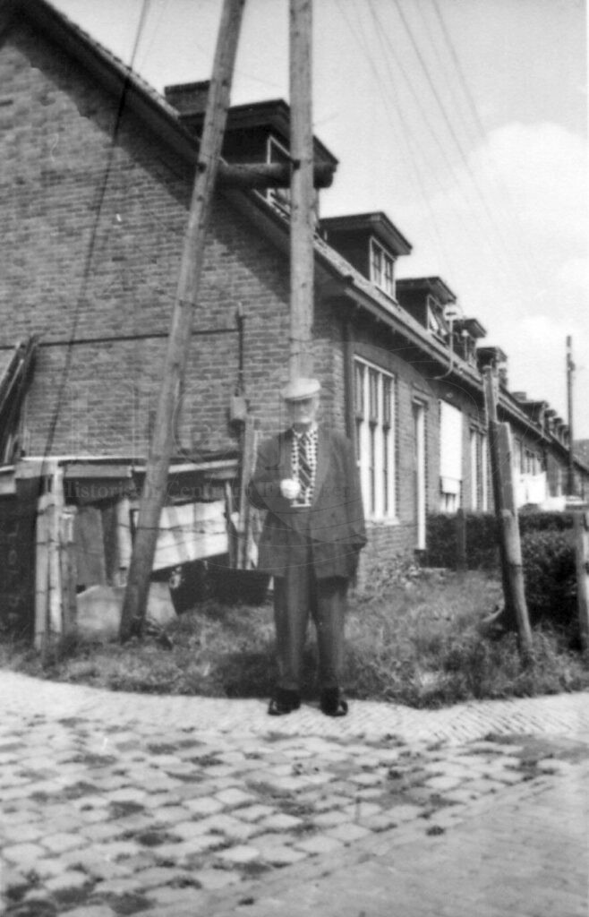 Een oudere man voor een rijtje huizen in "De driehoek"